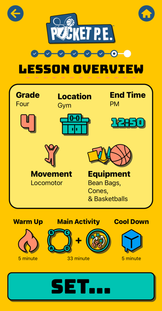 Almost none! That’s the beauty of Pocket PE. You can generate a complete, standards-based lesson in seconds. Just select your teaching environment, available equipment, and desired movement skill focus, and the app creates your entire lesson. The short training videos can be watched right before class to prepare you for teaching.